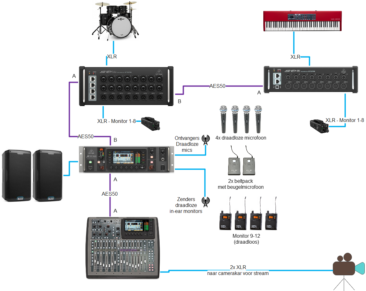 - Het signaal volgt een specifiek pad van stagebox naar de mixer.